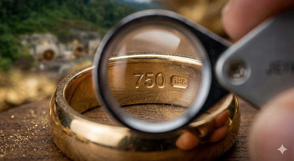 Leta efter stämplar som ”18K”, ”750” eller den svenska ”Kattfoten”. Om stämplar saknas kan en professionell handlare testa metallen med syra eller röntgen.