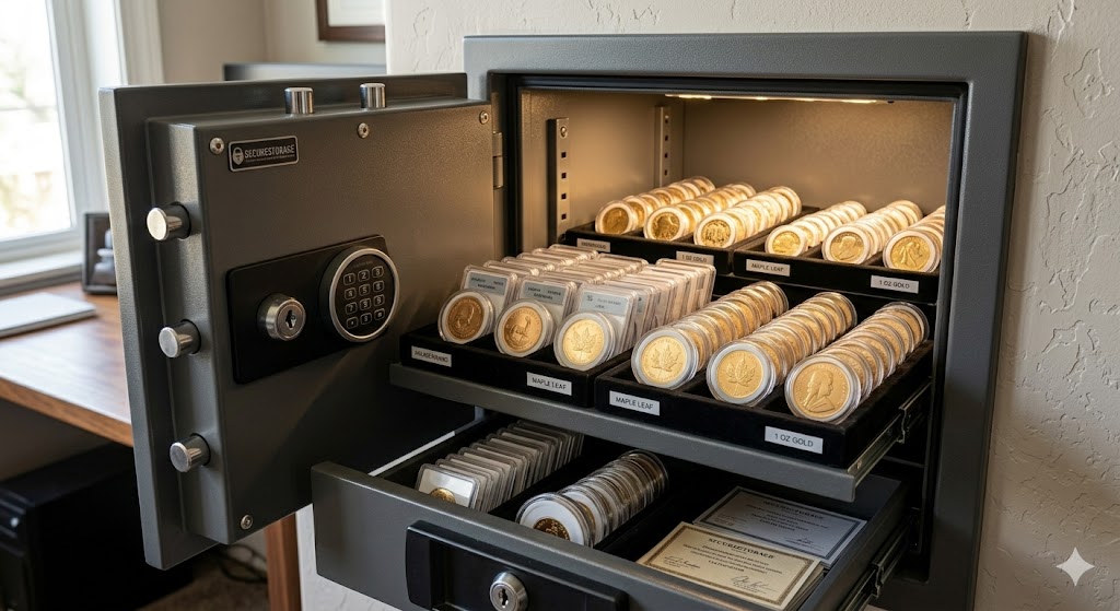 När man börjar ackumulera en mängd guldmynt blir frågan om säker förvaring central. Det finns tre huvudalternativ: bankfack, hemförsäkrat kassaskåp eller externa valvförvaringar. Att förvara guld hemma innebär en risk för stöld och kräver ofta tilläggsförsäkringar om beloppen överstiger vissa gränser. Bankfack har blivit allt mer sällsynta i takt med att bankkontor stänger ner, vilket har lett till att specialiserade ädelmetallvalv har blivit ett populärt alternativ för större innehav.